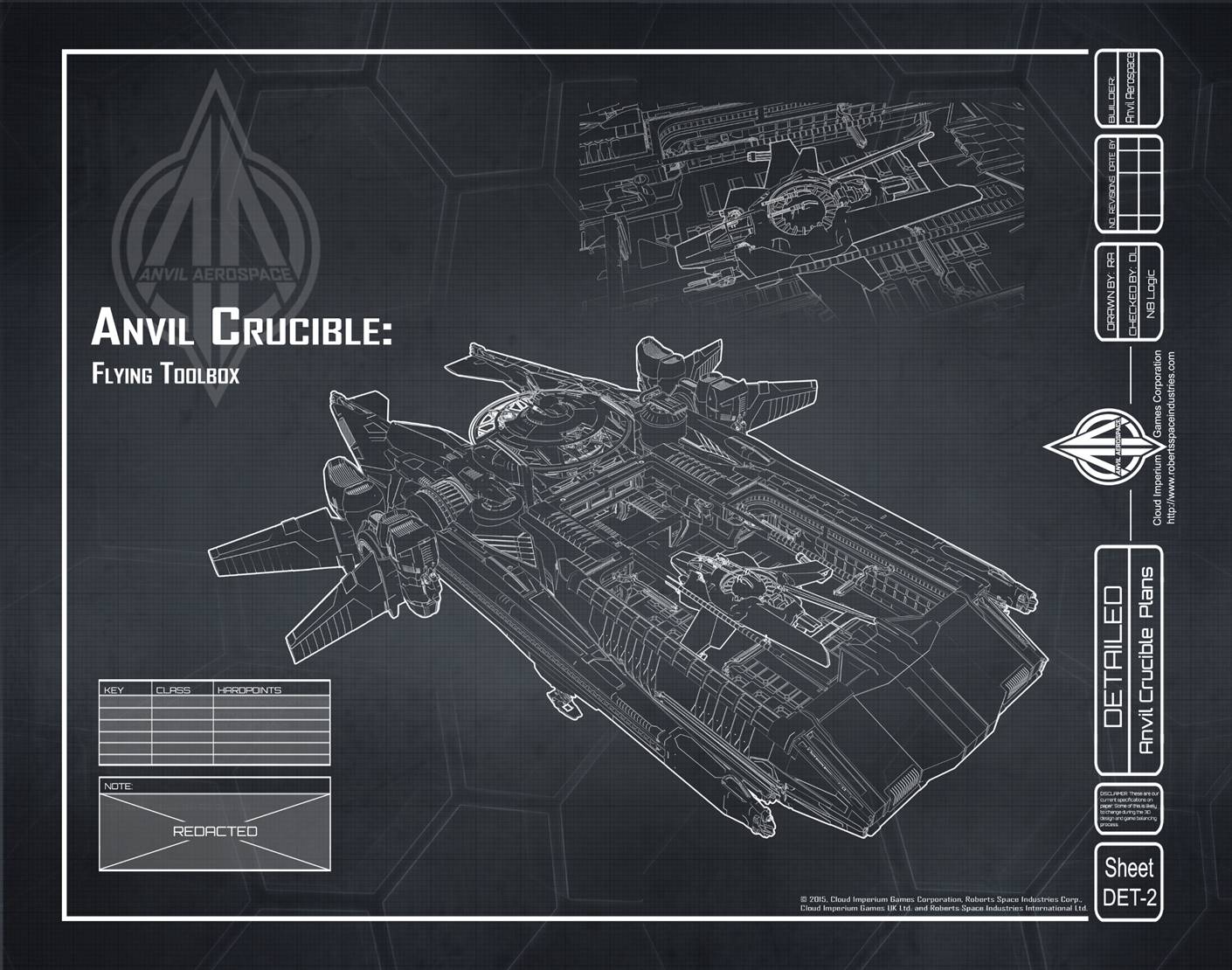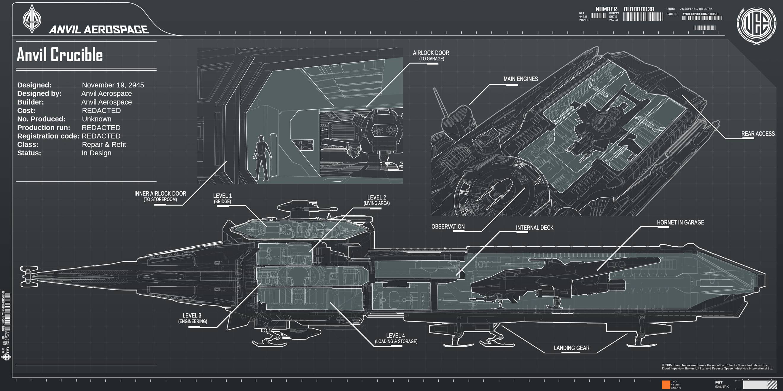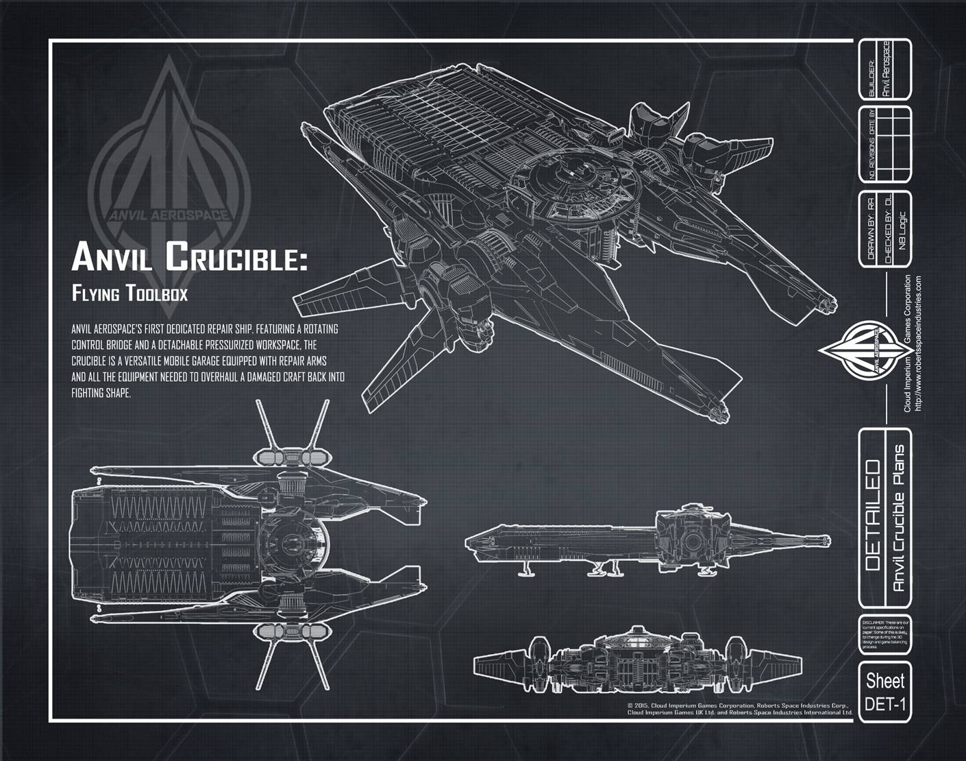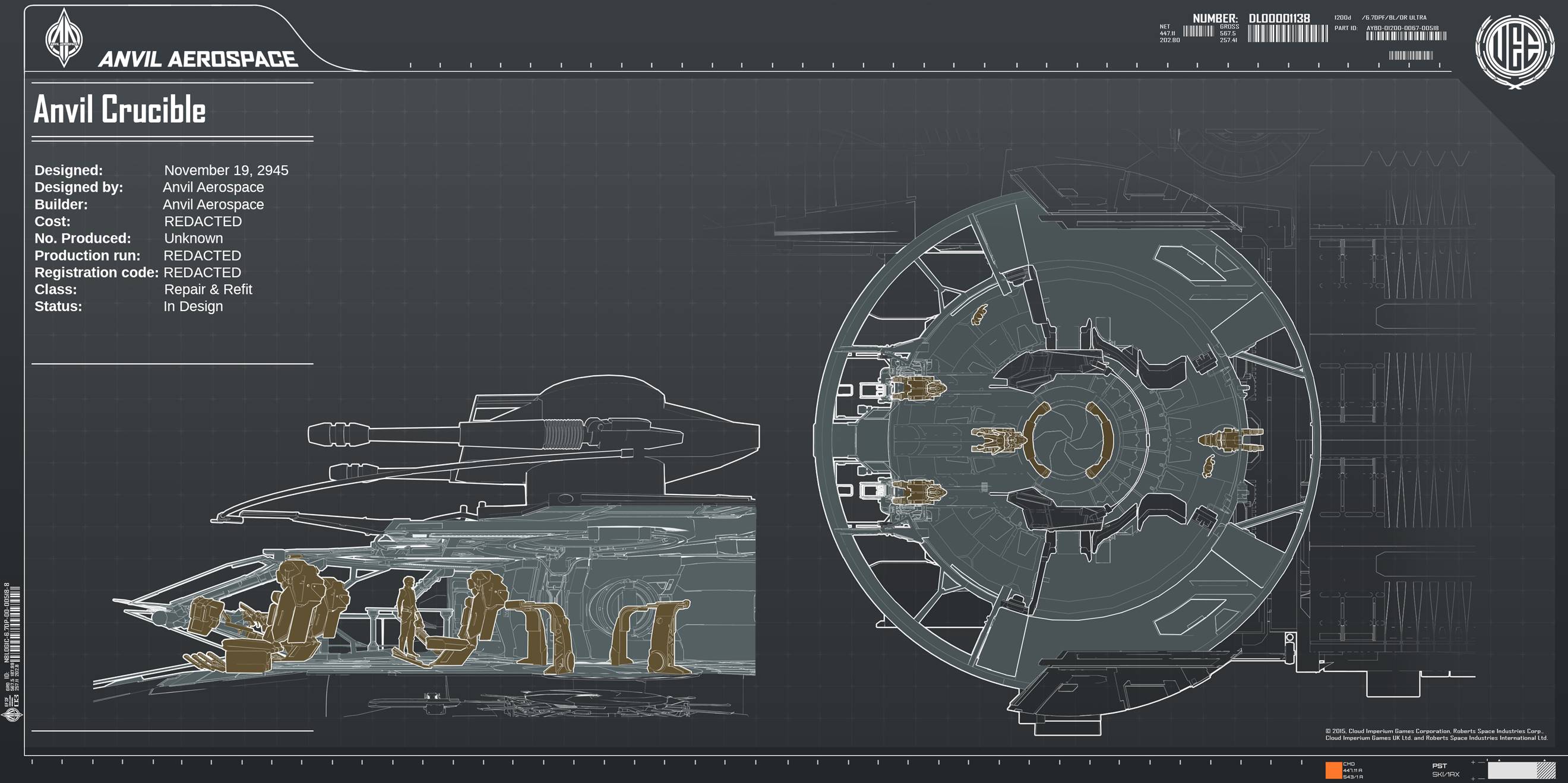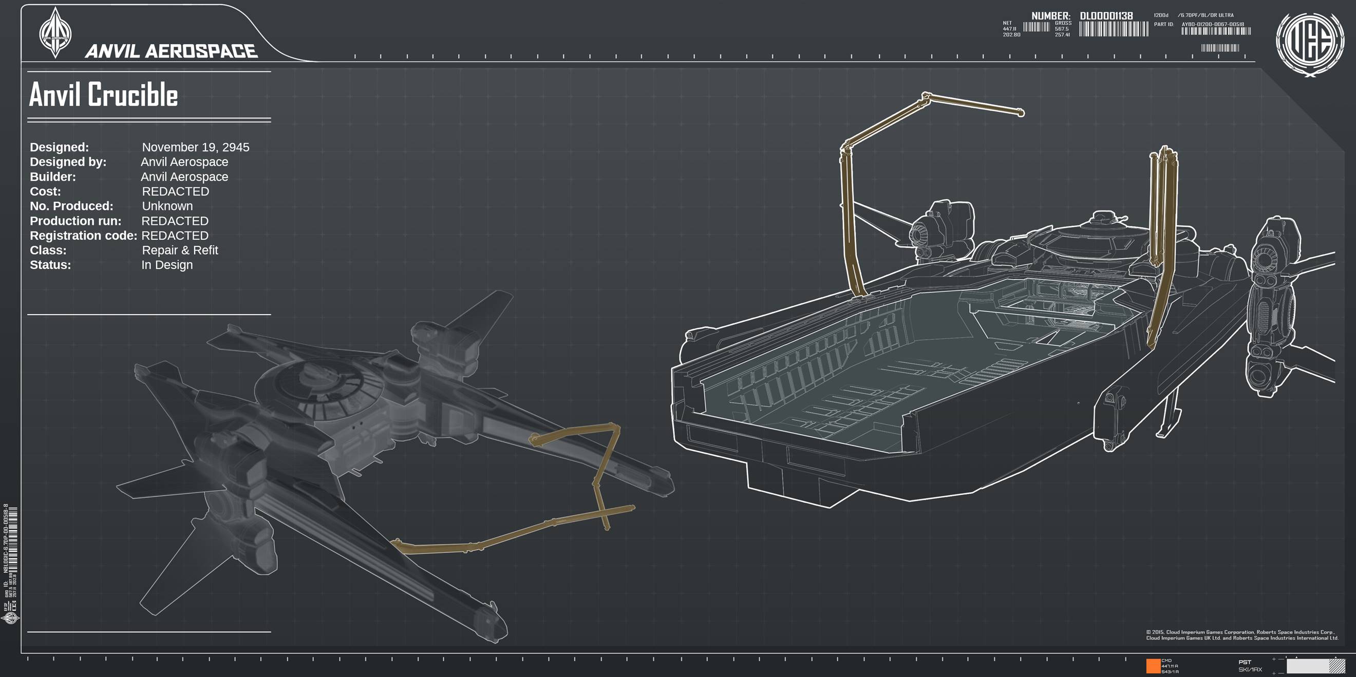 Die Crucible ist ein Reparaturraumschiff, das von Anvil Aerospace für die United Empire of Earth Navy (UEEN) entwickelt wurde, um vor Ort Reparaturen an einer Vielzahl von Schiffsklassen durchzuführen.