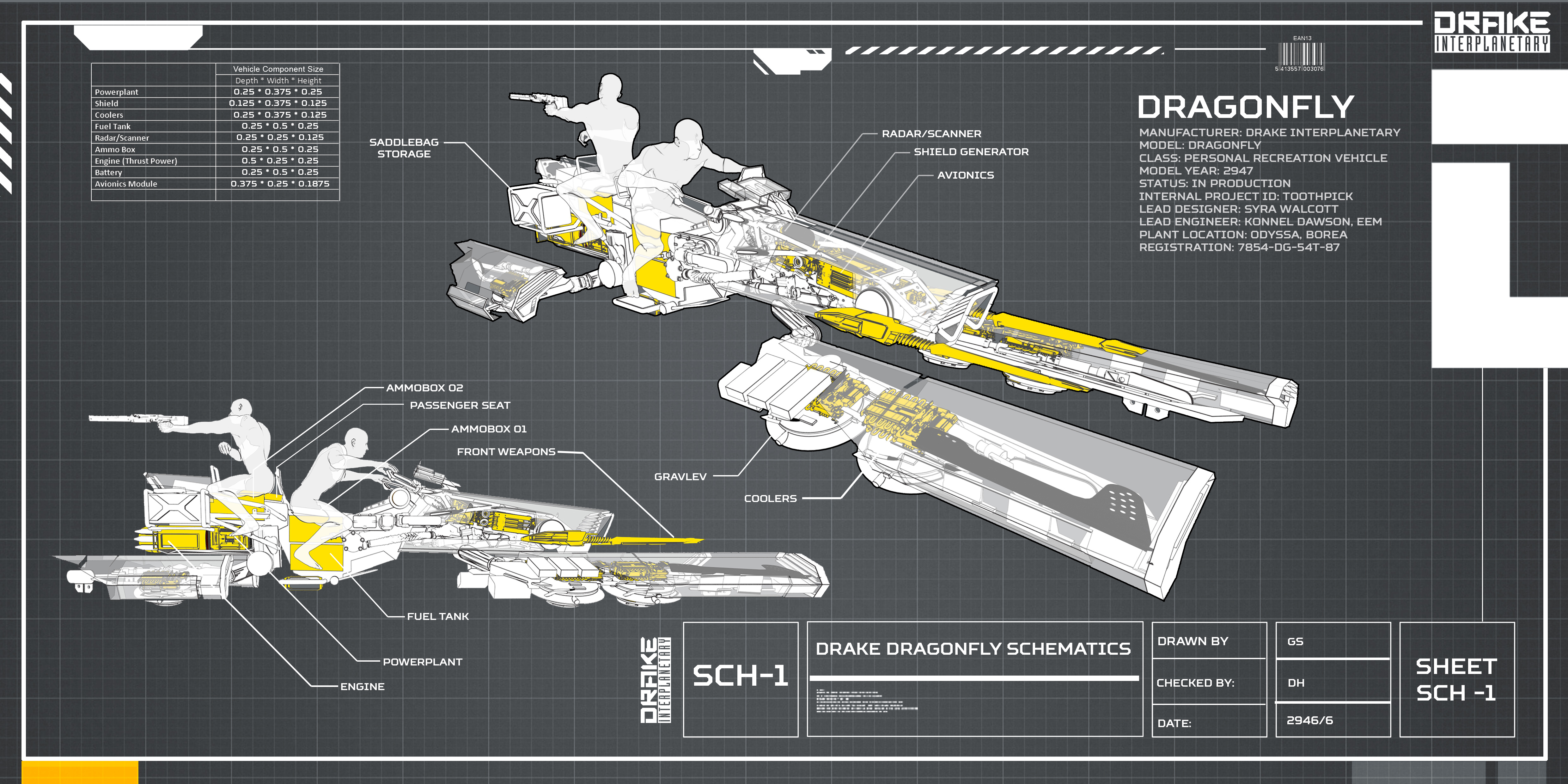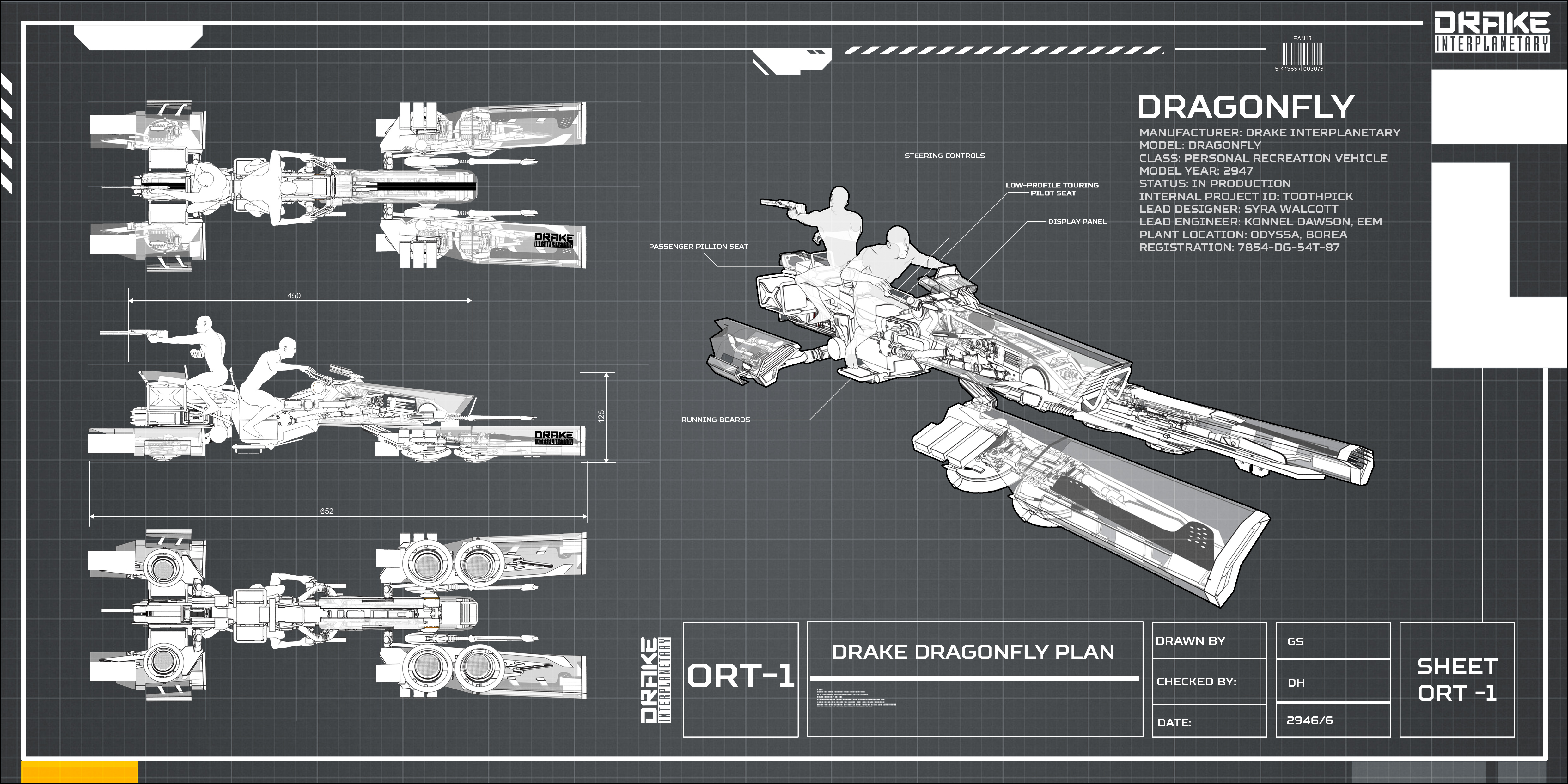 Die Dragonfly ist zwei Person Raum- und Bodenfahrzeug, dass von Drake Interplanetary verkauft wird. Gebaut um an Bord größerer Raumschiffe untergebracht zu werden, ist es Teil von Drakes kooperativem Netz von Schiffen neben der Cutlass und Caterpillar. Dragonflies werden sowohl als bodengebundene Transporter als auch als Snub-Schiffe zur Unterstützung von Operationen im Weltraum eingesetzt. Sie sind nicht in der Lage, selbst einen planetaren Wiedereintritt durchzuführen. Ihre Farbvarianten sind Yellowjacket und Black.